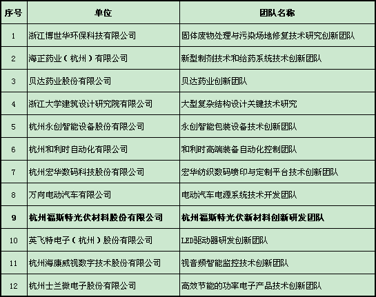近日,經單位申報、區縣(市)人力社保局推薦、市十大產業辦審核、專家評審、答辯,杭州福斯特光伏材料股份有限公司的“杭州福斯特光伏新材料創新研發團隊”入選杭州市第一批市級十大產業企業技術創新團隊。